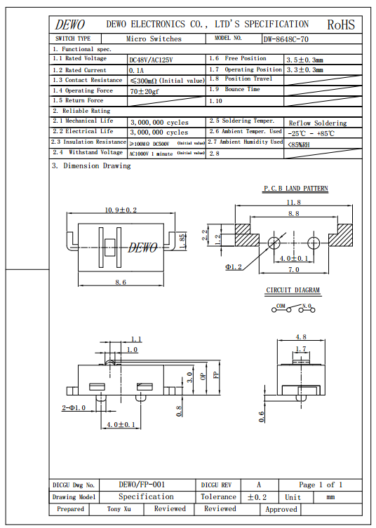 超小型微動(dòng)開(kāi)關(guān) CM1873101S100-2